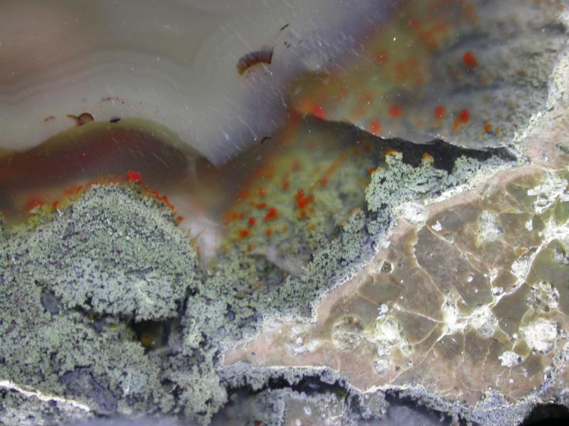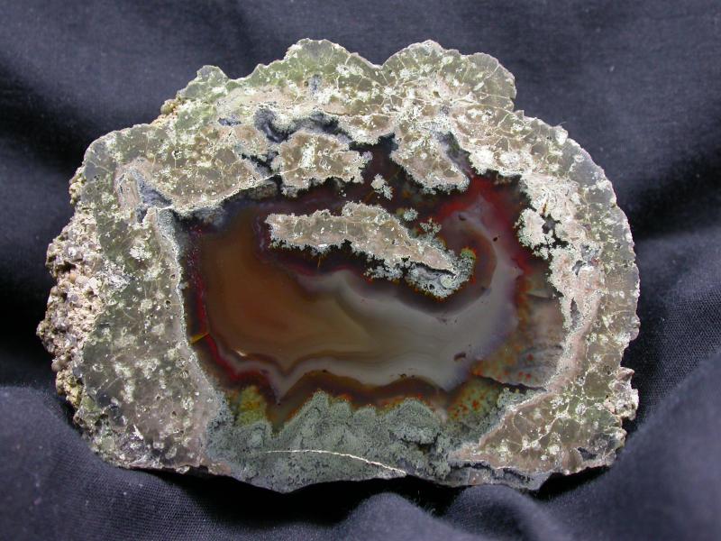 An unusual and lovely thunderegg characterized by its graceful agate swirls in a clear mossy 'pond' marked with small red flecks.
