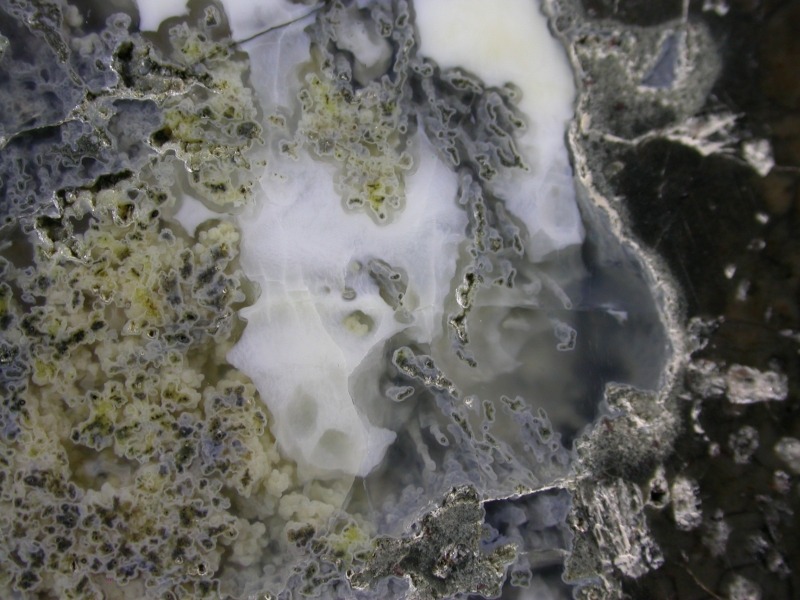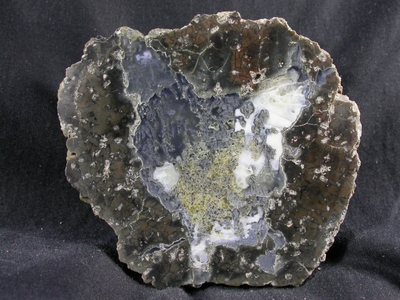 This complex and remarkable thunderegg has a strong growth of blue and yellow moss, blended in with white common opal.